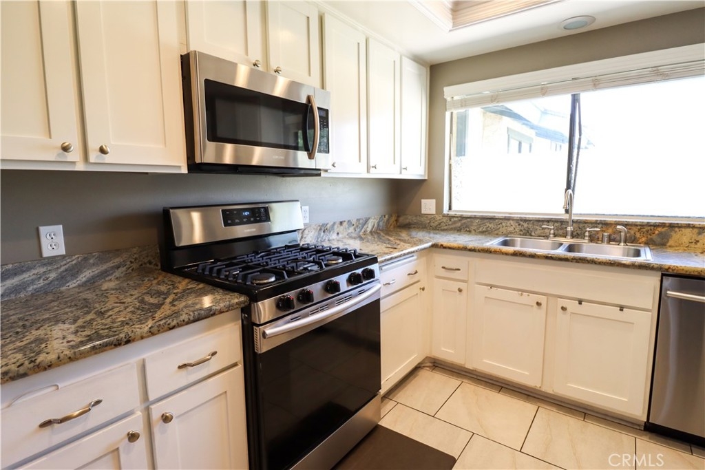 Welcome to the gated community of Olive Wood Village. This beautiful unit offers 2 bedrooms, 2 bath with two parking spaces. Open floor plan with tile floors, bright white kitchen cabinets, stainless steel dishwasher and microwave, and two large bedrooms. A laundry closet inside the condo and a private patio with a side entrance. Unit comes with a covered carport and uncovered parking space. This community features a pool, spa, clubhouse, and mail room and ample guest parking. Conveniently located close to shopping, schools, public transportation and major freeways.