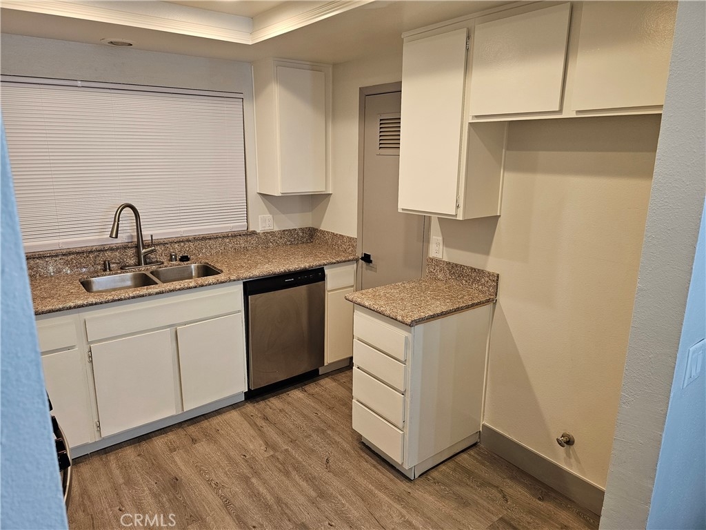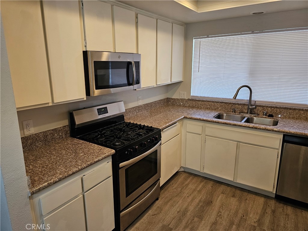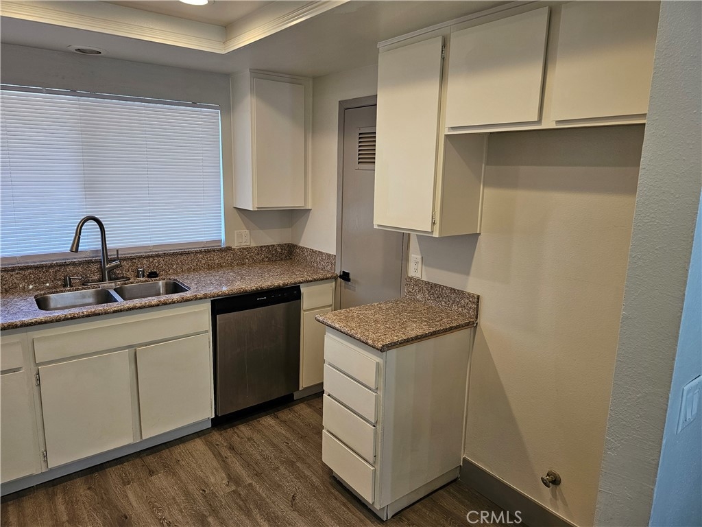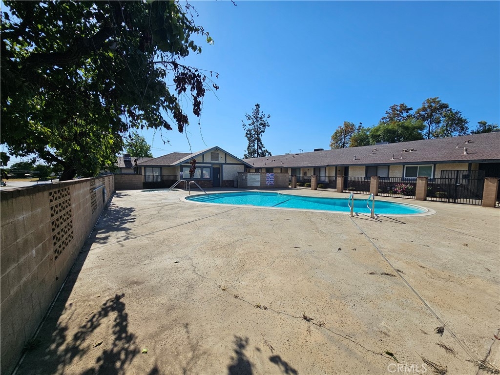 Beautifully Upgraded Single-Story Condo in Gated Community This stunning single-story condo offers comfort, style, and privacy with no neighbors above or below. Featuring beautiful laminate flooring throughout, granite countertops, and a spacious family room with soaring wood-beamed ceilings that flows seamlessly into the dining area. Two generously sized bedrooms provide ample space, while the private fenced-in covered patio is perfect for pets or outdoor relaxation. Located in a quiet, secure setting within a gated community that includes green spaces and a refreshing HOA pool and spa. Private Dog Park. HOA covers water, trash, outside maintenance. Two parking spots per unit.