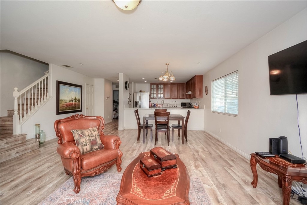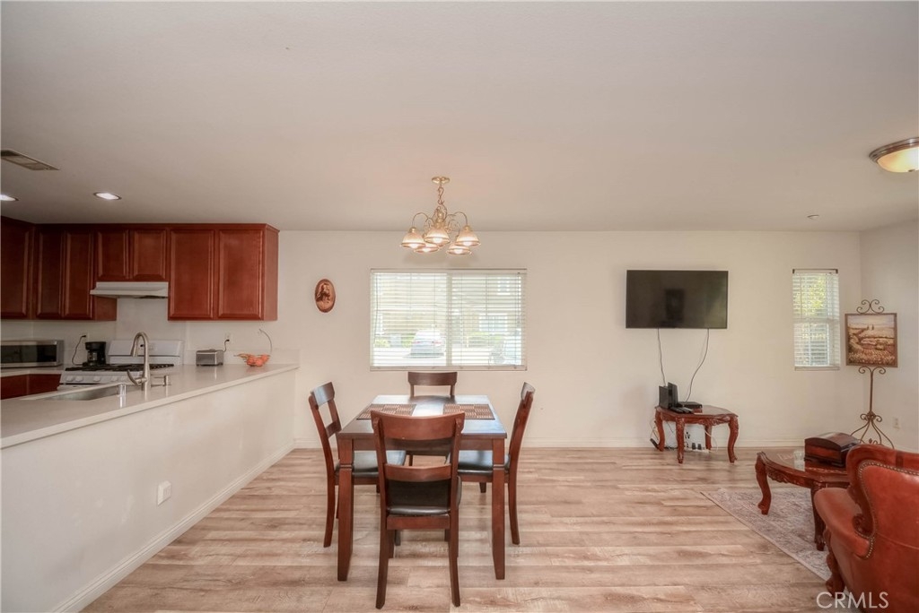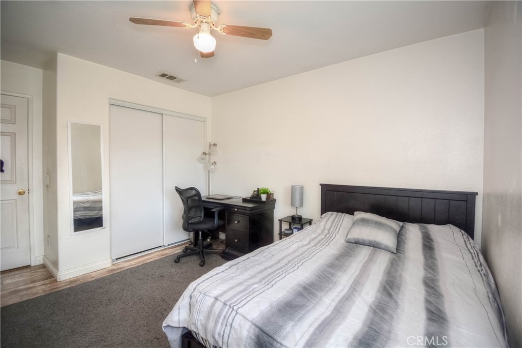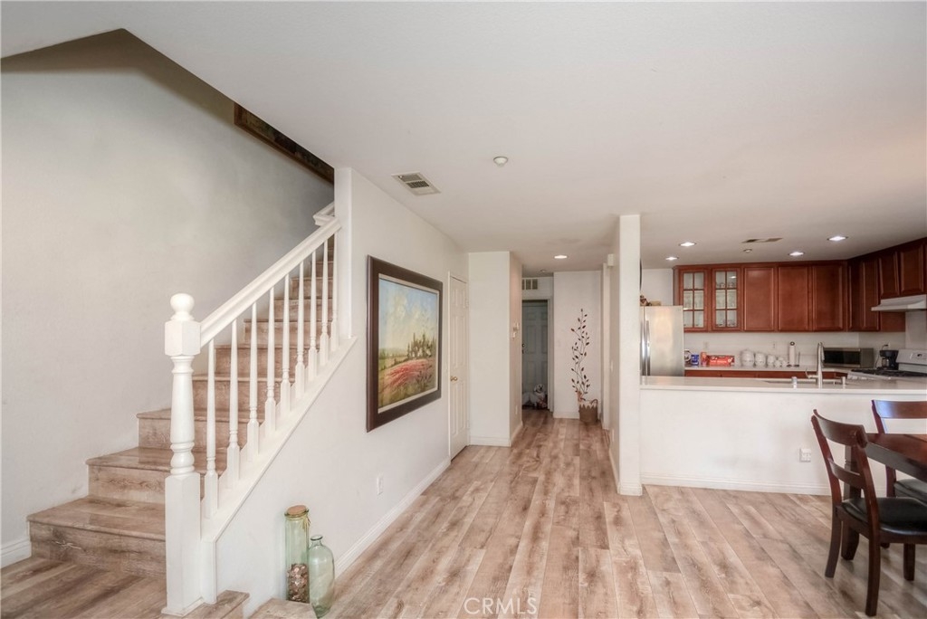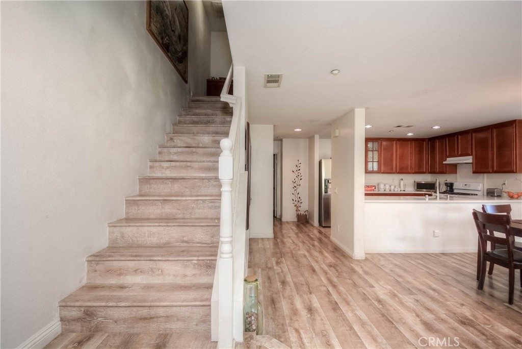 A Must-See Gem! This adorable 2-bedroom, 2.5-bathroom condo is perfectly situated in the heart of Moreno Valley. Inside, you'll find a spacious living room and a chef's kitchen adorned with stunning, newly updated white quartz countertops, sleek white appliances, and a stylish stainless steel farmhouse sink with a modern faucet. The entire home features elegant wood laminate flooring and ceiling fans in every room for comfort. The primary suite boasts a bright and airy bedroom, a walk-in closet, and a luxurious bathroom with dual sinks, perfect for convenience and style. Upstairs, there’s a generously sized second bedroom and a full bathroom, while the main level offers a convenient laundry room and powder room right next to the kitchen. An oversized attached garage provides ample storage, and additional parking is available with a HOA permit. This charming condo is nestled in the popular and secure gated community of Palacio De Oro South. You can enjoy the incredible amenities offered by the Moreno Valley Ranch including access to a clubhouse, park, pool, BBQ area, playground, and even a private lake with fishing, paddle boats, and delightful ducks!