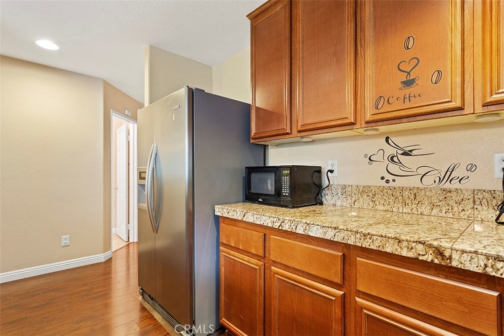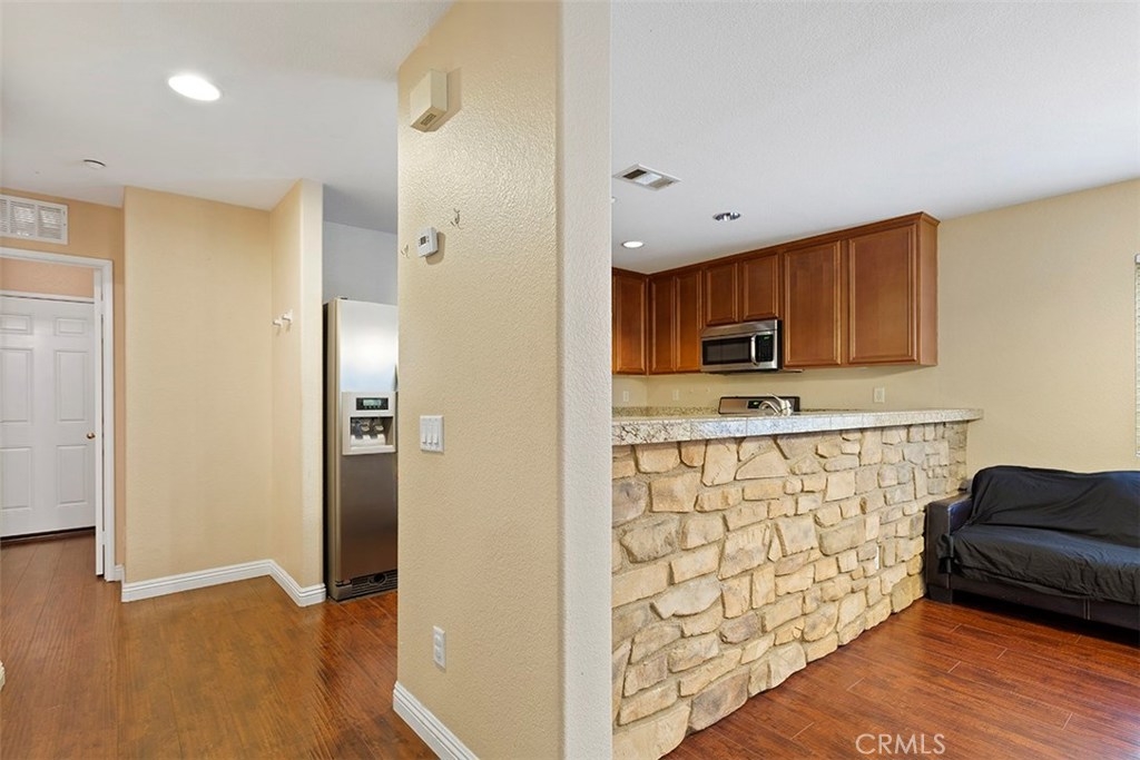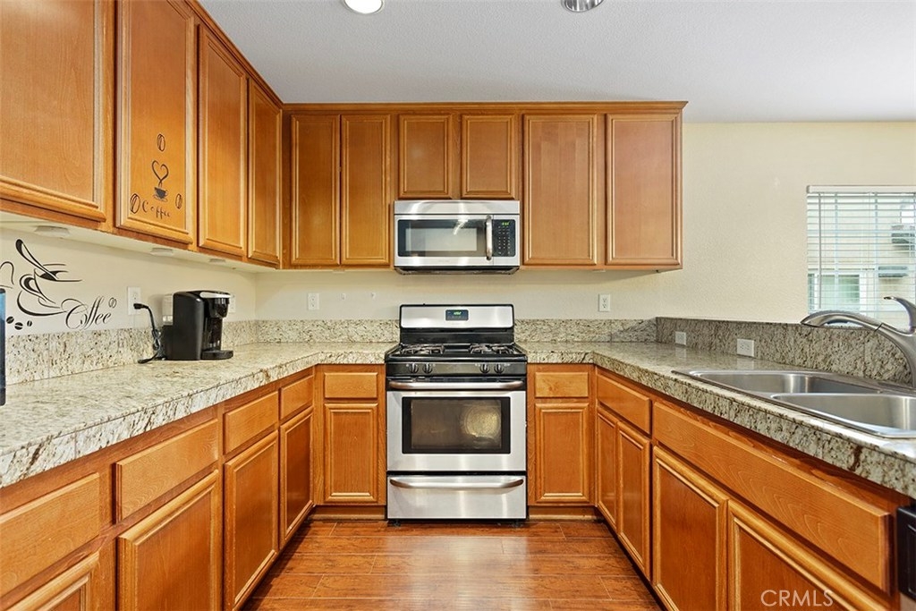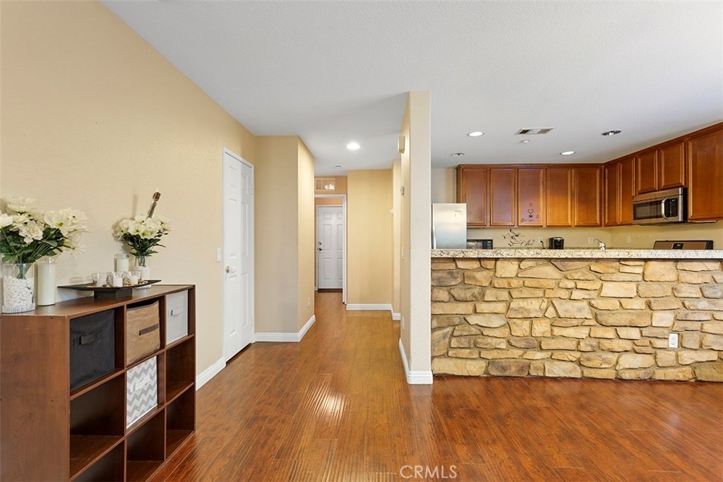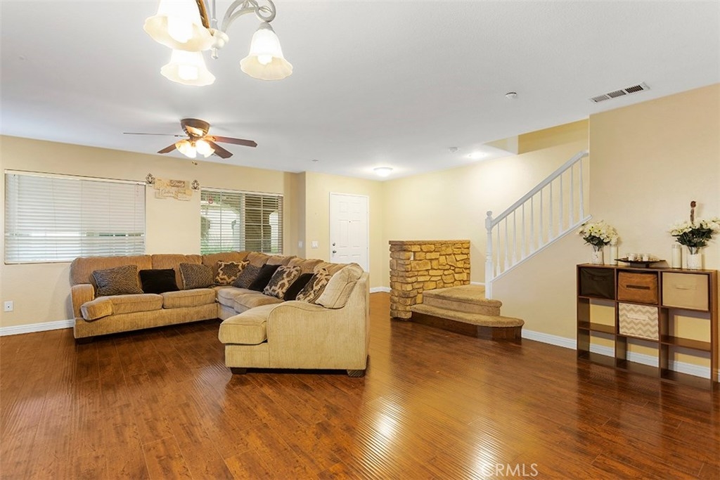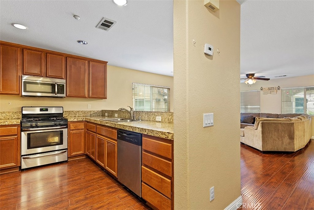 This gorgeous condo is a MUST see! Located inside Palacio de Oro; enjoy a small, private community; with the bonus of enjoying all the amenities (including: pool, spa, playground, paddle boats, BBQ areas, etc) of the Moreno Valley Ranch Lake Club located across the street. Just down the road is Lakeside Plaza, where you'll find plenty food choices, Stater Brothers, and much more. This condo is also a short drive to schools, including Moreno Valley Community College, parks, and Lake Perris. This condo welcomes you with a cozy front porch; enter into a spacious open floor plan, with stunningly beautiful wood laminate flooring, and custom stone work. The kitchen has endless amounts of cabinet and counter space, stainless steel appliances, and recessed lighting. You also have the luxury of your own laundry room, with stacked washer and dryer, and one car garage. You'll be amazed how huge the master bedroom is, and appreciate the sizable master bath with his and her sinks. The second bedroom is also very roomy. Don't let this amazing condo pass you by! Schedule a viewing appointment today.