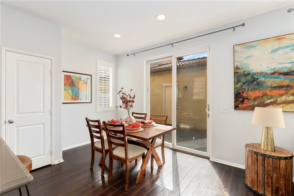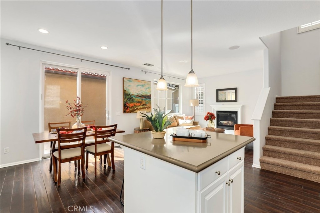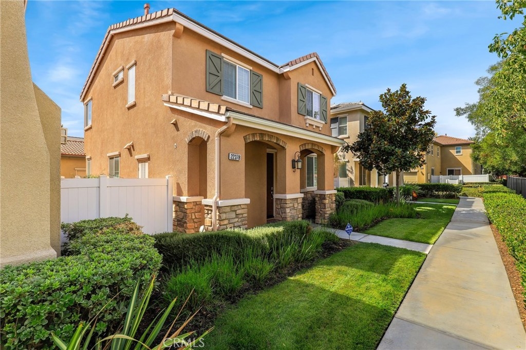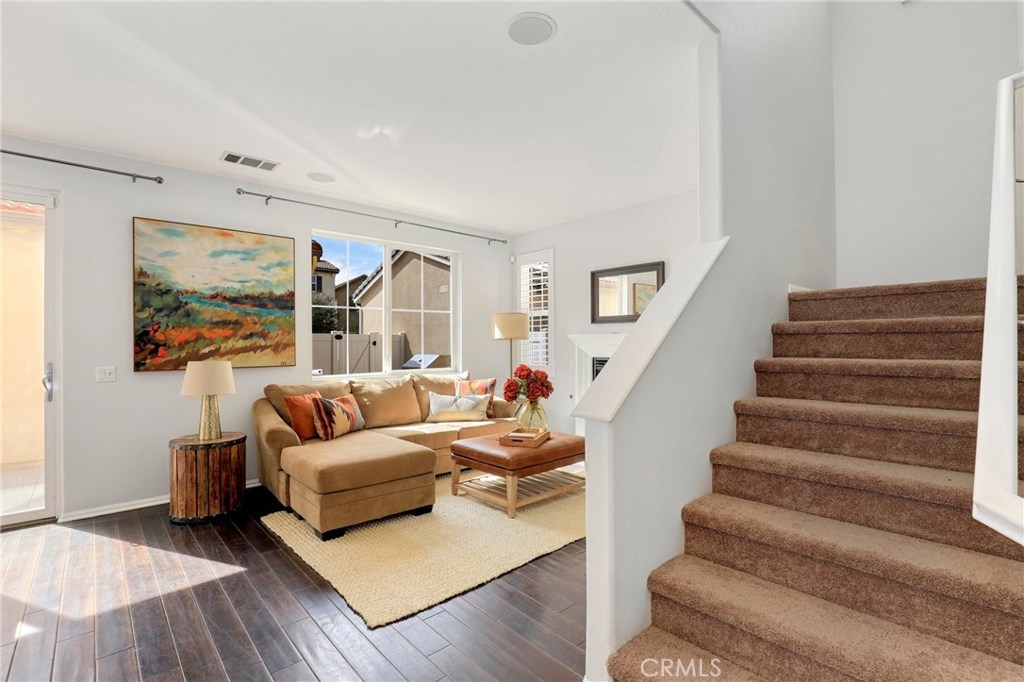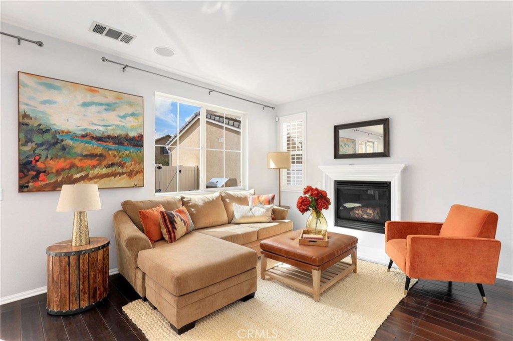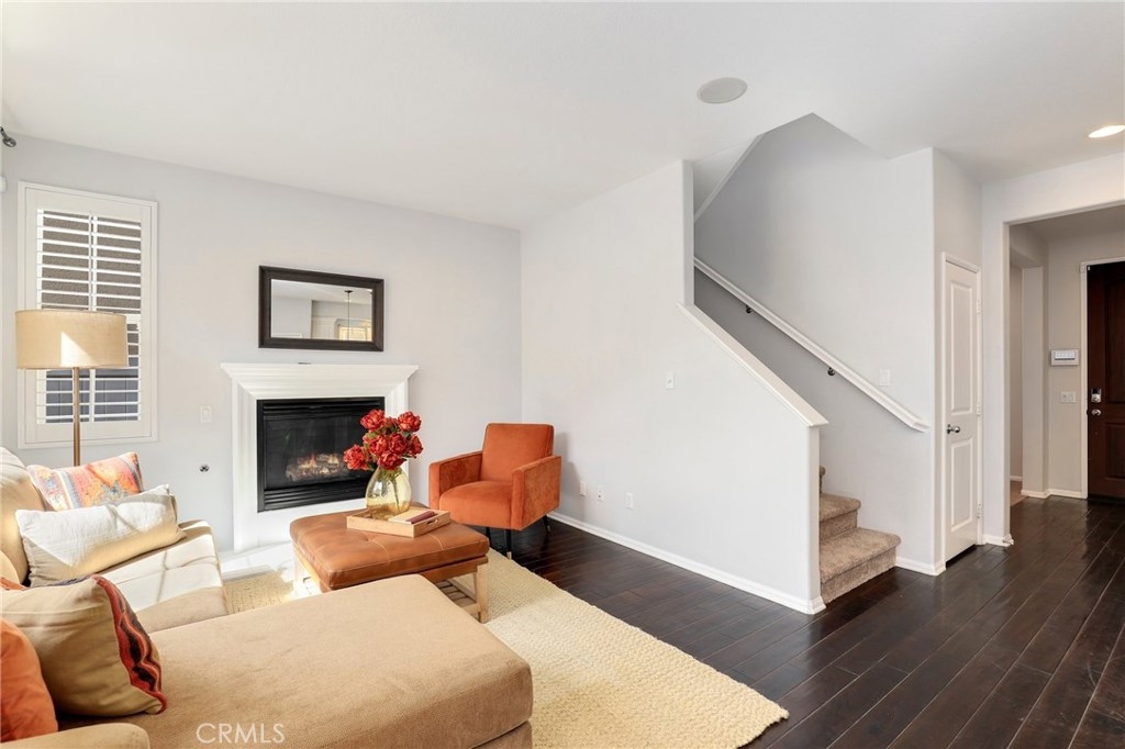 This meticulously maintained two-story condo features gorgeous hardwood floors, new carpeting, plantation shutters, and upgrades throughout. The main floor offers a classy living room/den, dining area off of the kitchen, an inviting family room w/fireplace, and a laundry room. The kitchen features an island, Caesarstone countertops, stainless steel appliances, white cabinets, designer backsplash, and windows & slider looking out to the back patio. Upstairs, the spacious master suite has a spa-like bathroom w/ double sinks, large shower, soaking tub, and walk-in closet. The secondary bedrooms share a full bath. Additional features include a two-car garage. Relax in the backyard w/ built-in BBQ island. Residents of Towngate Park enjoy rear-facing garages that allow for a meandering walking trail throughout the grounds. Schools, parks, shopping, dining, and entertainment are all nearby.