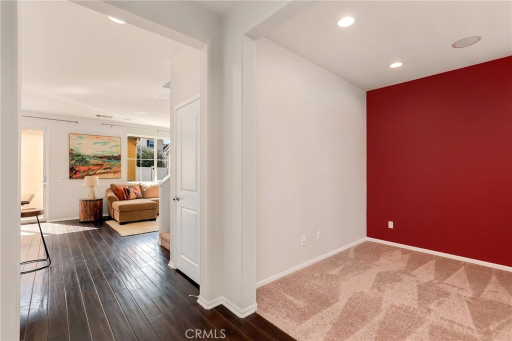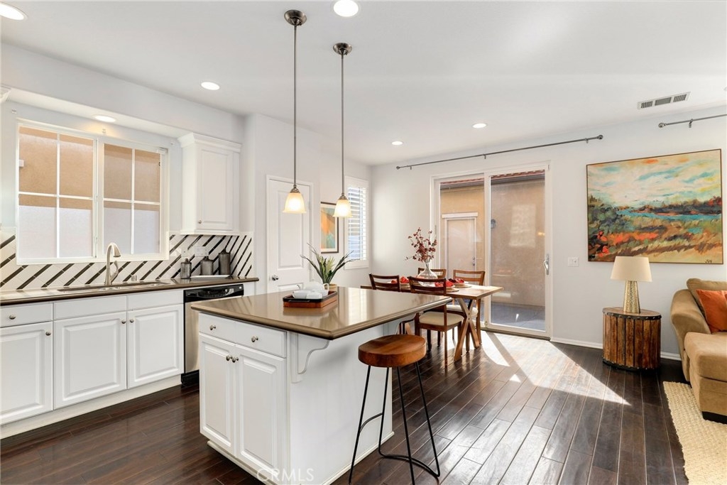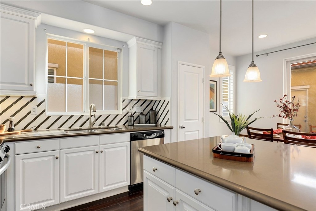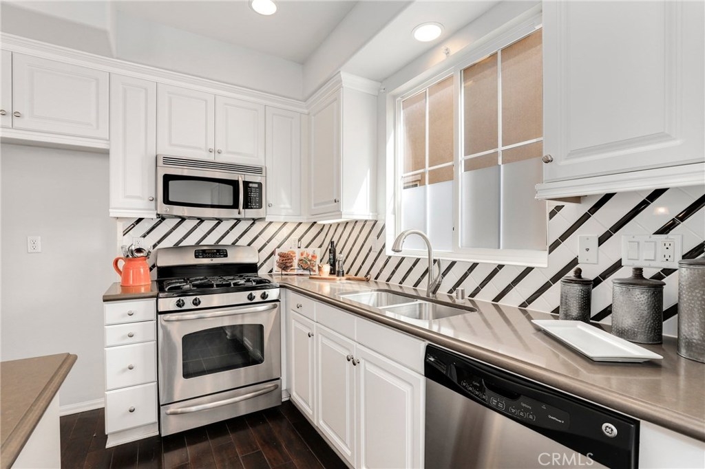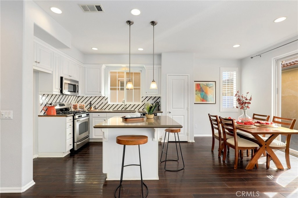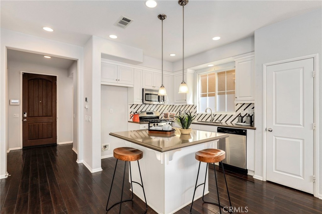This meticulously maintained two-story condo features gorgeous hardwood floors, new carpeting, plantation shutters, and upgrades throughout. The main floor offers a classy living room/den, dining area off of the kitchen, an inviting family room w/fireplace, and a laundry room. The kitchen features an island, Caesarstone countertops, stainless steel appliances, white cabinets, designer backsplash, and windows & slider looking out to the back patio. Upstairs, the spacious master suite has a spa-like bathroom w/ double sinks, large shower, soaking tub, and walk-in closet. The secondary bedrooms share a full bath. Additional features include a two-car garage. Relax in the backyard w/ built-in BBQ island. Residents of Towngate Park enjoy rear-facing garages that allow for a meandering walking trail throughout the grounds. Schools, parks, shopping, dining, and entertainment are all nearby.