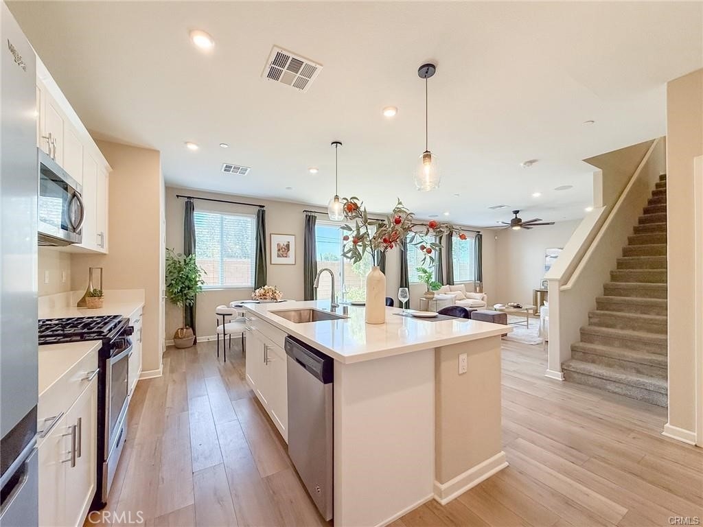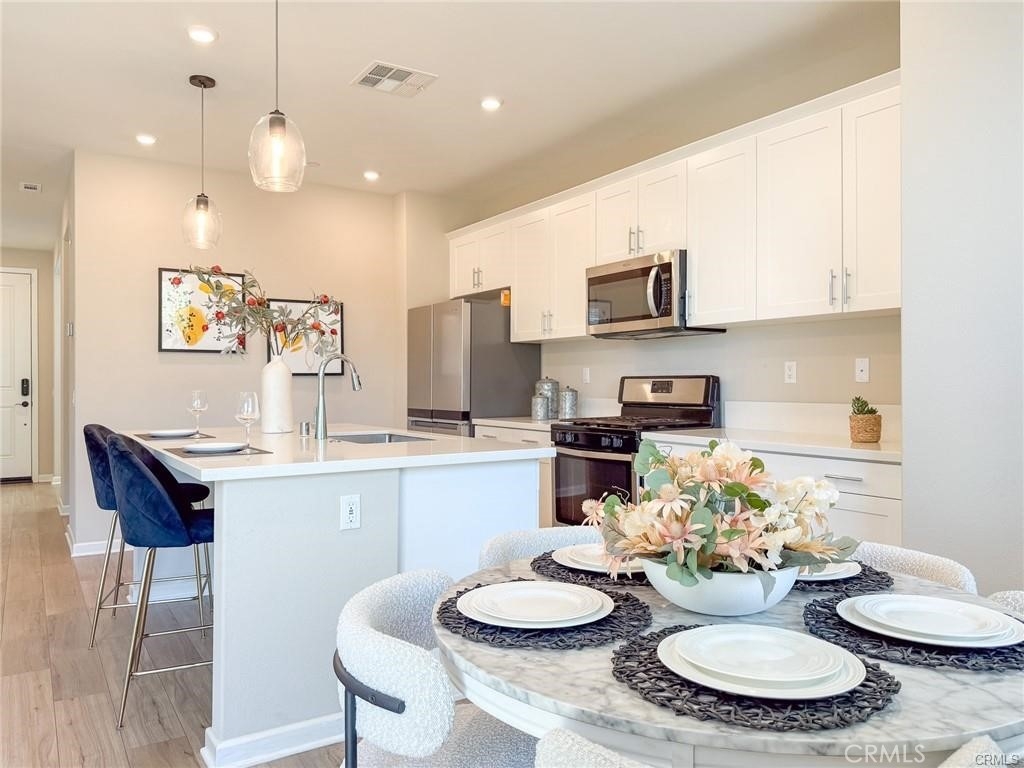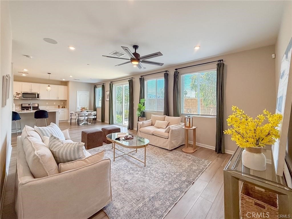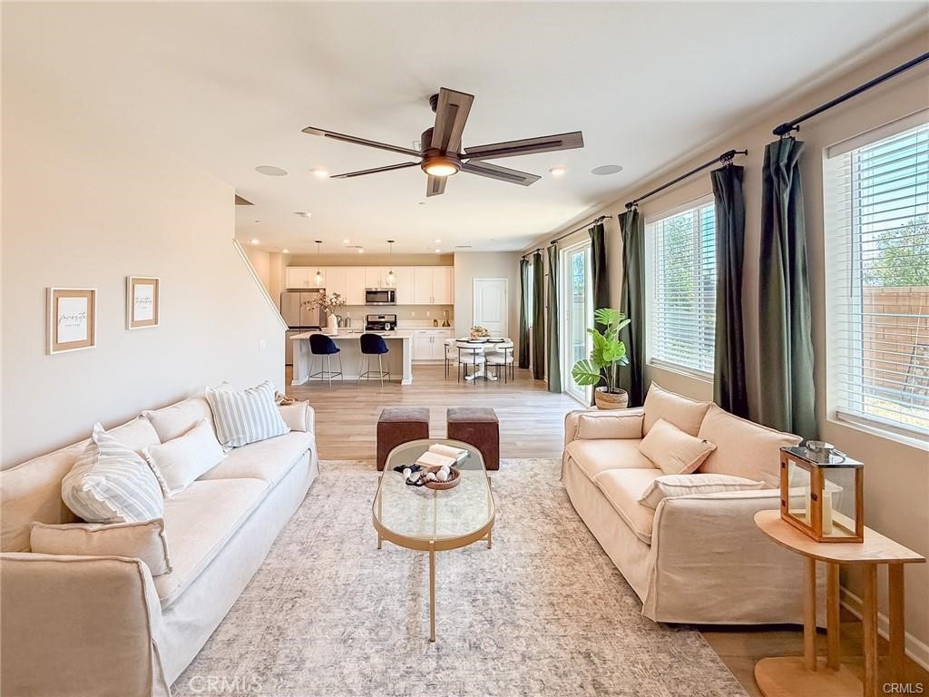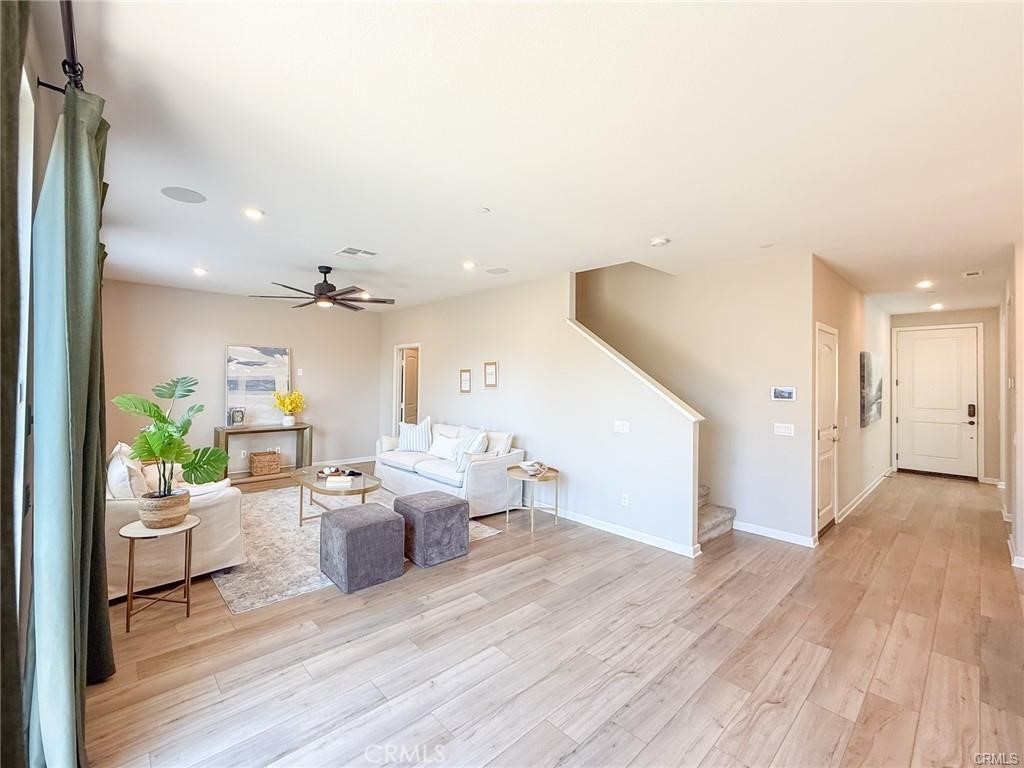 A beautifully maintained former model home located in a desirable gated community in Moreno Valley. Built in 2021, this newer single-family residence offers 4 bedrooms, 2.5 bathrooms, plus a downstairs office and an upstairs loft, providing flexible living space for today’s modern lifestyle. The home features builder-upgraded finishes throughout, including luxury vinyl plank flooring, quartz countertops, stainless steel appliances, and smart-home technology. As the original model, it has been meticulously cared for and remains in pristine condition. The open-concept kitchen with a large center island flows seamlessly into the dining and living areas, creating an inviting space for both everyday living and entertaining. Upstairs, the spacious loft serves perfectly as a secondary lounge, study area, or playroom. The large primary suite includes a walk-in closet and a dual-sink vanity. A fully landscaped backyard offers a private outdoor retreat, while the attached two-car garage provides added convenience. Located in a quiet gated community with amenities such as a pool, playground, and BBQ area, and just minutes from shopping, dining, schools, and major freeways—this home delivers the ideal blend of comfort, style, and accessibility.