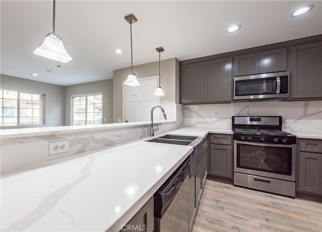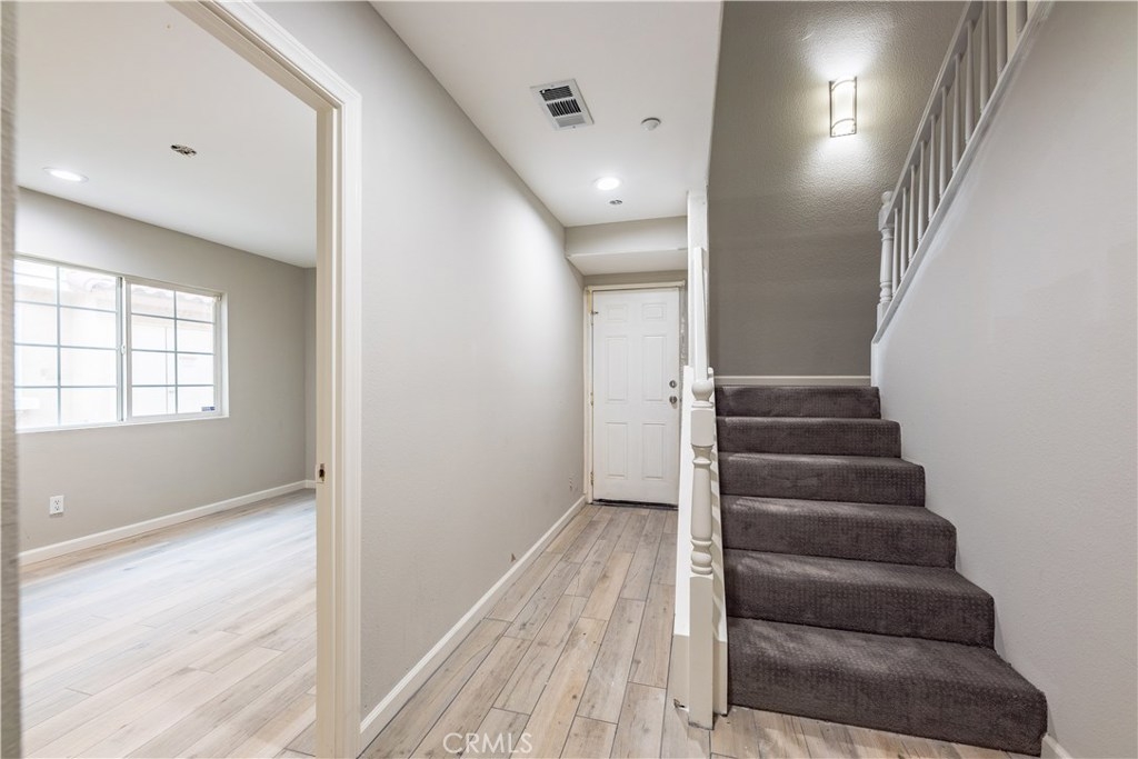 THIS TURNKEY TOWNHOME/CONDO HAS BEEN COMPLETELY RENOVATED. Located inside the highly sought after gated community of Palacio de Oro. This home has it's very own front entrance porch with outside patio living area and direct access into a two car garage. As you enter you're welcomed with an open floor plan and recessed lighting throughout, the upgraded beautiful flooring in the living room leads into the newly renovated kitchen with new cabinets, new countertops, new appliances and new lighting, NO DETAIL WAS SPARED. The downstairs bedroom also has the upgraded flooring with recessed lighting. Your guest bathroom downstairs has been renovated with new cabinets, tiled shower and flooring. As you make your way upstairs you are met with the conveniently located laundry space in the hallway. The master bedroom has an oversized walk in closet, the spacious room has plenty of natural light with recess lighting and carpet. The master bathroom has been renovated from floor to ceiling with his and her sink. This is a true gem, resort style living at it's finest with amenities like pool, spa, playground, paddle boats, BBQ areas (the list goes on) in the Moreno Valley Ranch Lake Club located right across the street. DON'T MISS OUT