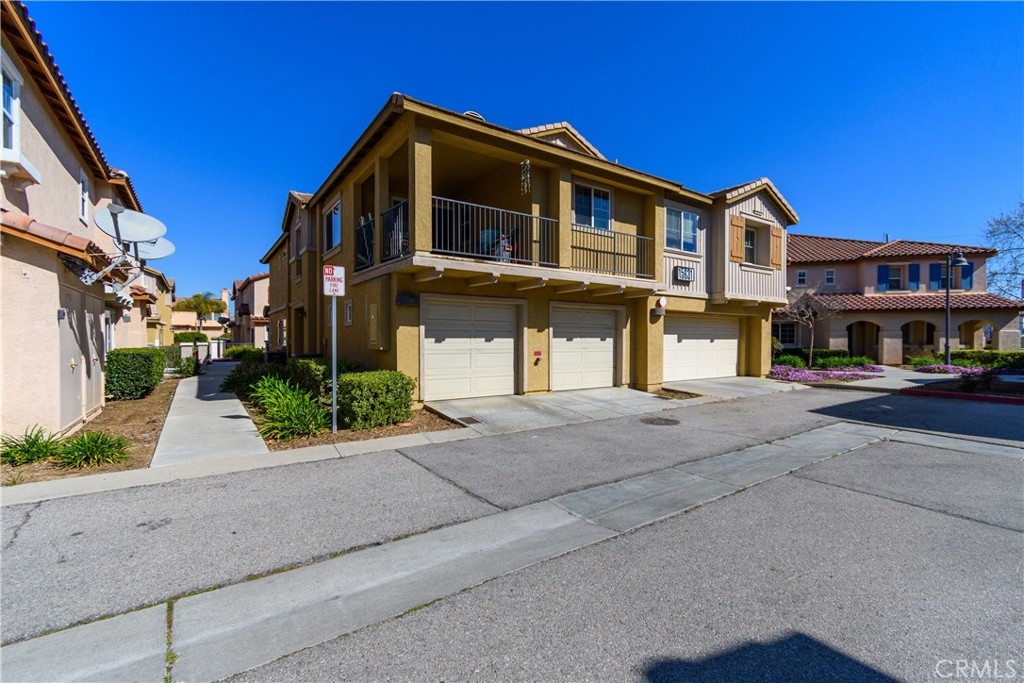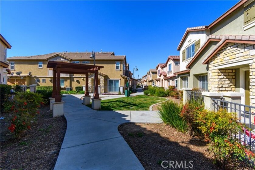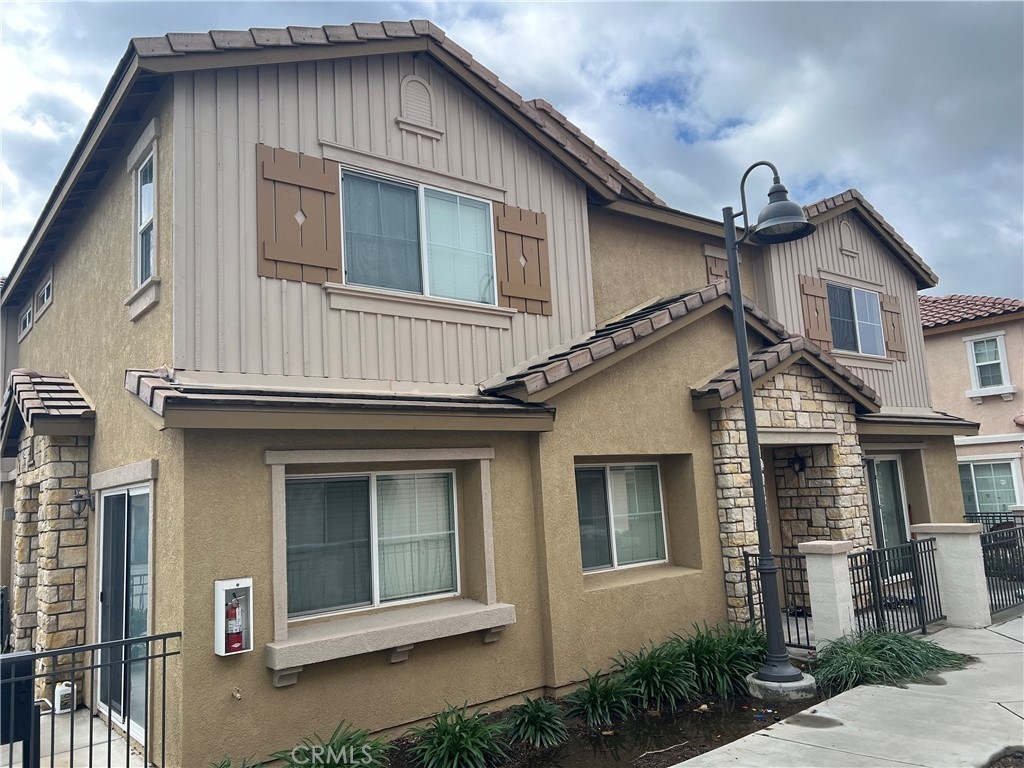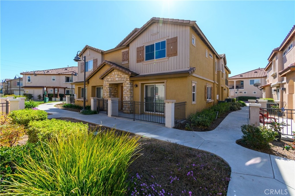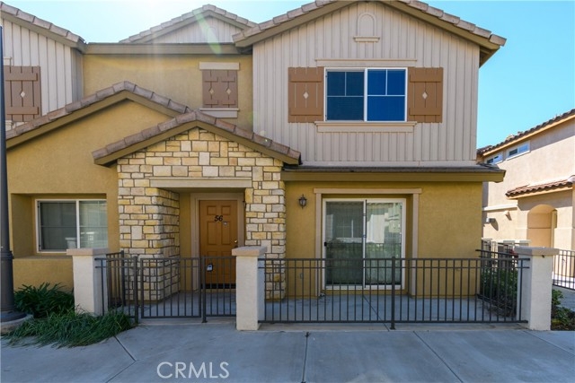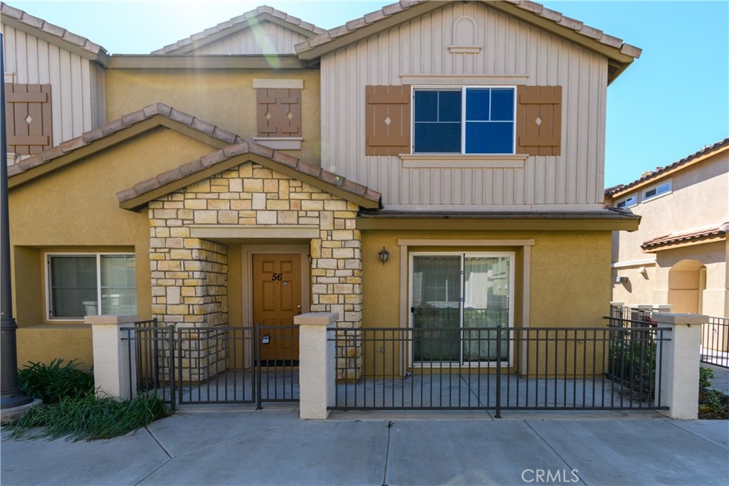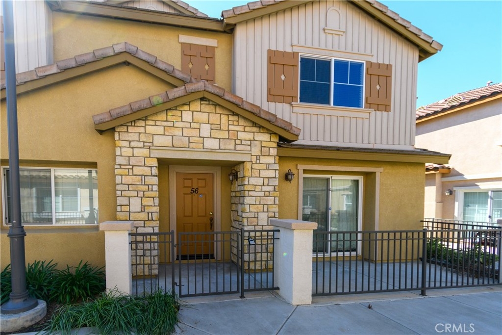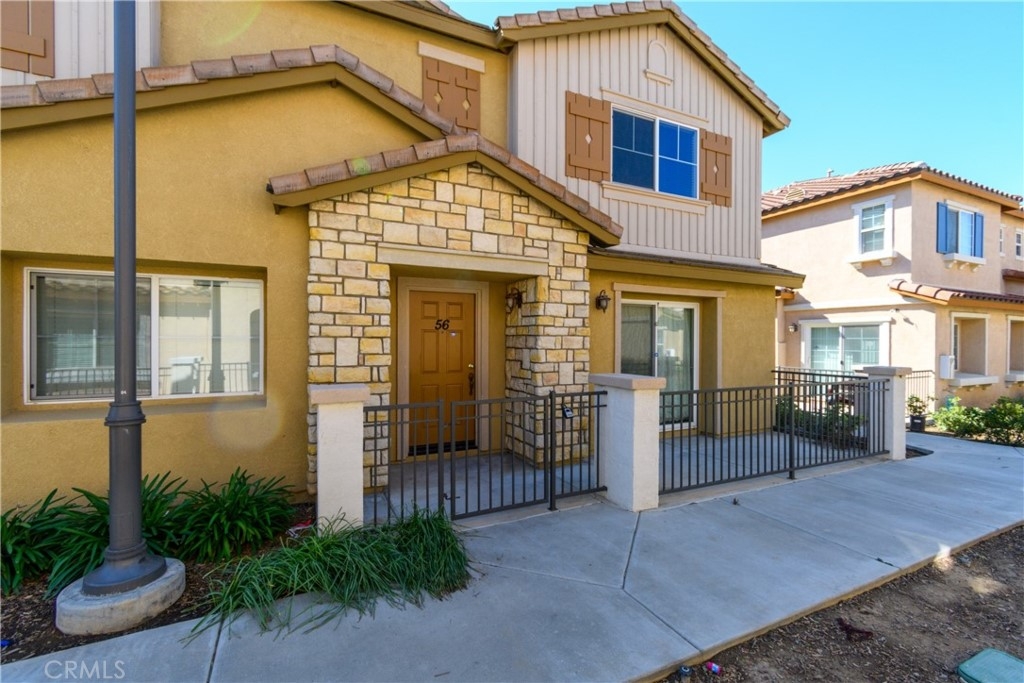 Welcome to Palacio De Oro North community, a gated community nestled in Moreno Valley. Unit #56, this 1444 sqft condo/townhouse offers 2 bedrooms, 2 1/2 baths, and an open plan layout with one car garage and many parking space in the community. The spacious living room seamlessly connects to the kitchen, boasting ample cabinet space and a pantry. Bedrooms are generously sized, complemented by an indoor laundry room for added convenience. The master suite features a walk-in closet and a private bath with dual sinks. HOA covers landscaping, security, and external repairs. While there's no pool, the community enjoys proximity to shopping centers, schools, hospitals, and colleges.